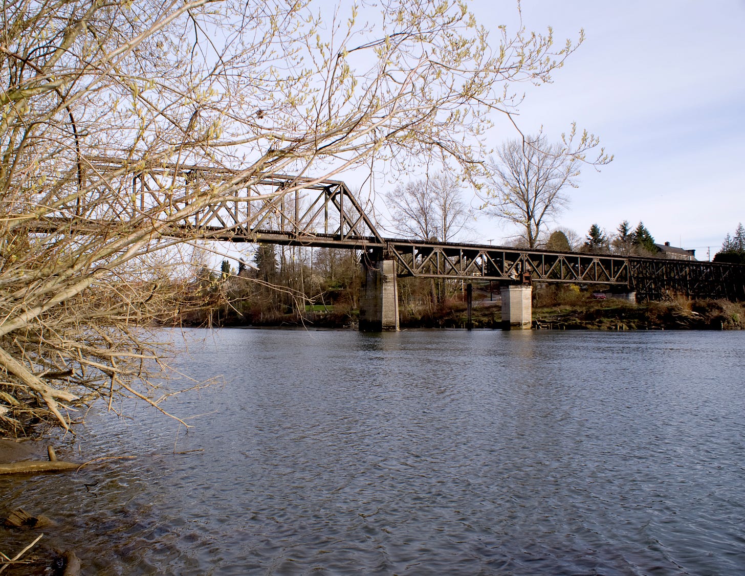 About the THEN photograph: The second railroad bridge over the Snohomish River as it appears today, without train traffic. Will that change this summer with the arrival of an excursion train to Snohomish?